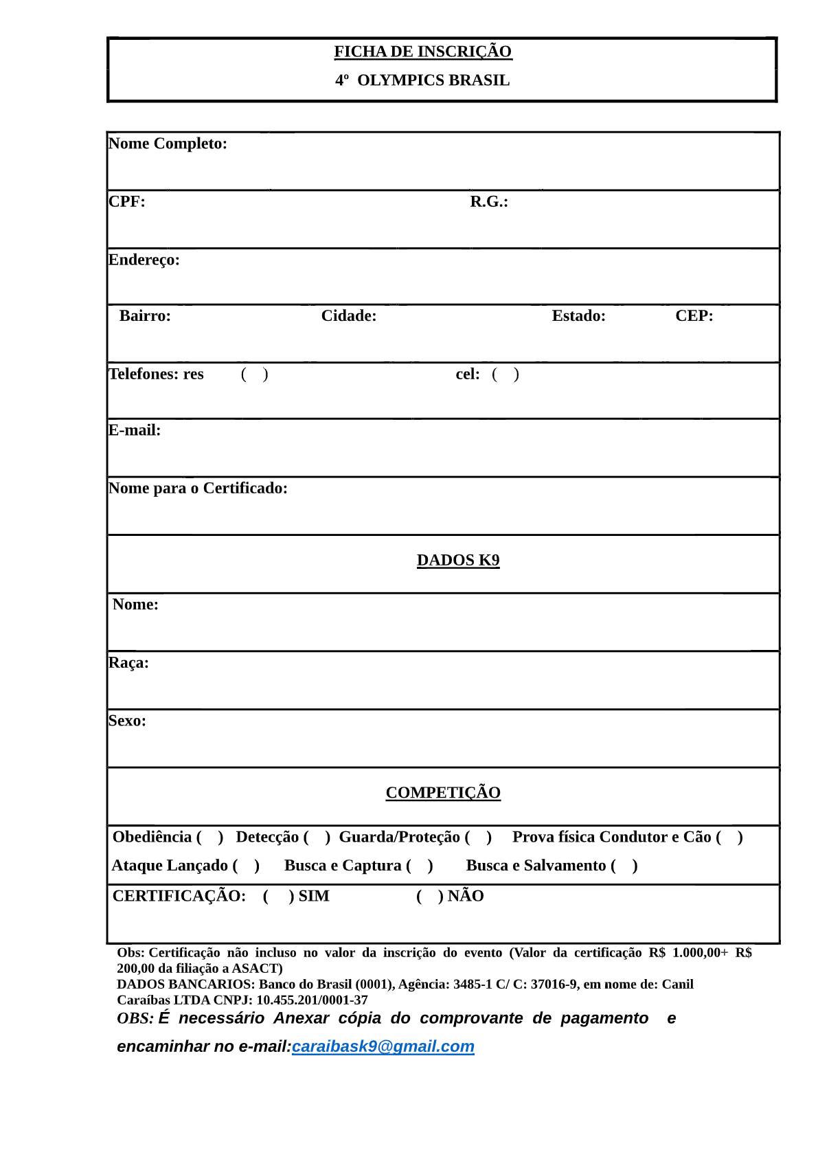 FICHA DE INSCRIÇÃO ( PREENCHER E ENVIAR POR EMAIL )